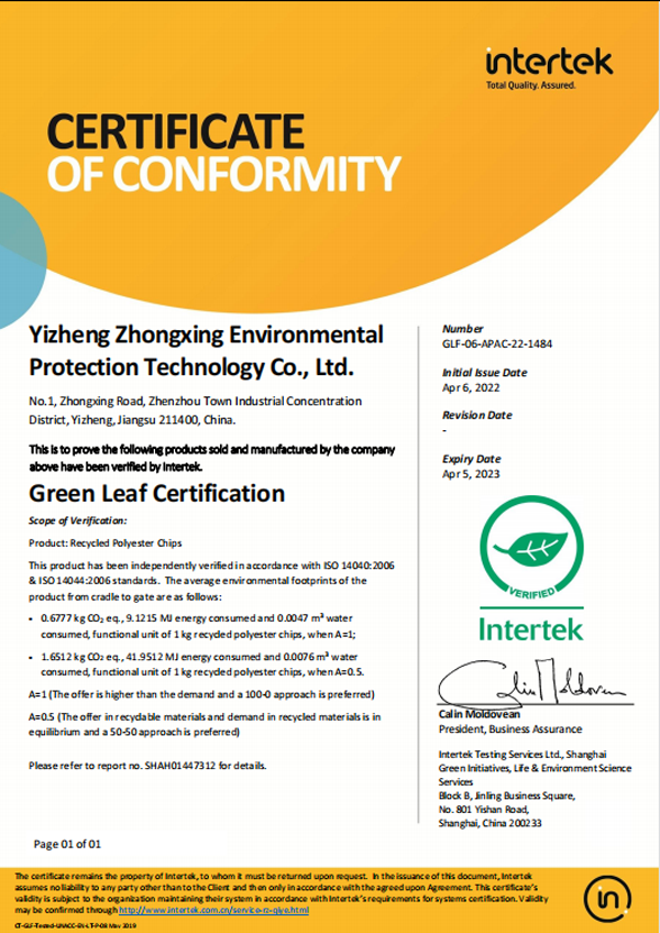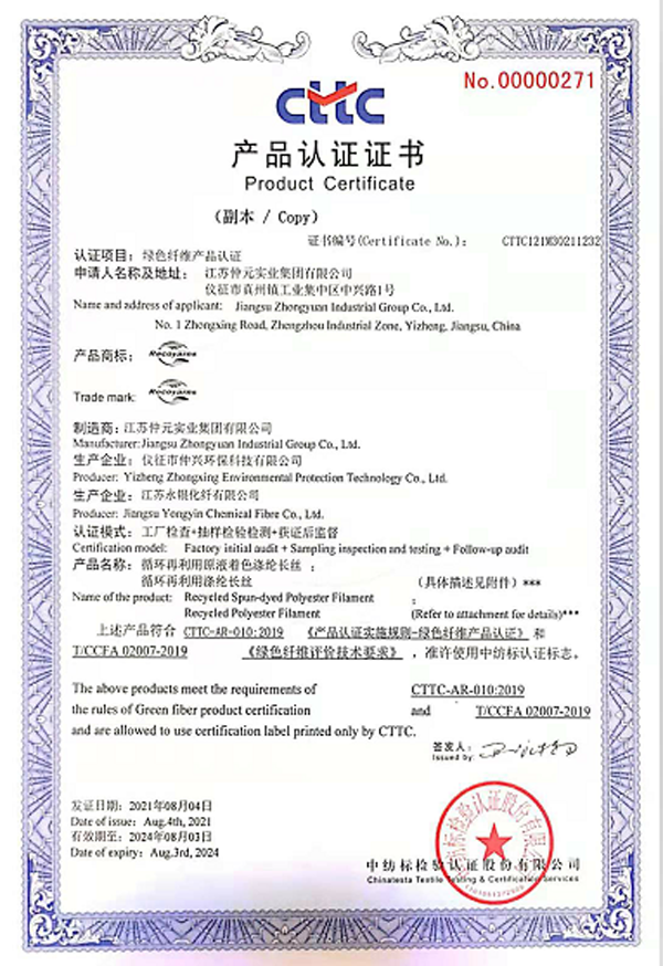 Jiangsu Zhongyuan Industrial Group Co., Ltd., under its subsidiaries Jiangsu Yongyin Chemical Fiber Co., Ltd., Yizheng Zhongxing Environmental Protection Technology Co., Ltd., and Zhongyuan International Trade (Shanghai) Co., Ltd., is a large-scale production enterprise specializing in the resource recycling and reuse of recycled polyester chips and recycled polyester yarns. The company currently has a capacity of 200000 tons/year for recycled polyester chips and 80000 tons/year for recycled polyester yarns. The company is a national high-tech enterprise and a recommended supplier by the China Filament Weaving Association. The company has the right to operate its own import and export business. Zhongyuan Group registered brand Recoyarns® has added unique Reco in tracking and identification technology to its recycled polyester chips, recycled polyester fibers, and products, which can qualitatively and quantitatively track and identify whether downstream products contain Recoyarns® Regenerated ingredients ensure the safety, uniqueness, and traceability of the product.
