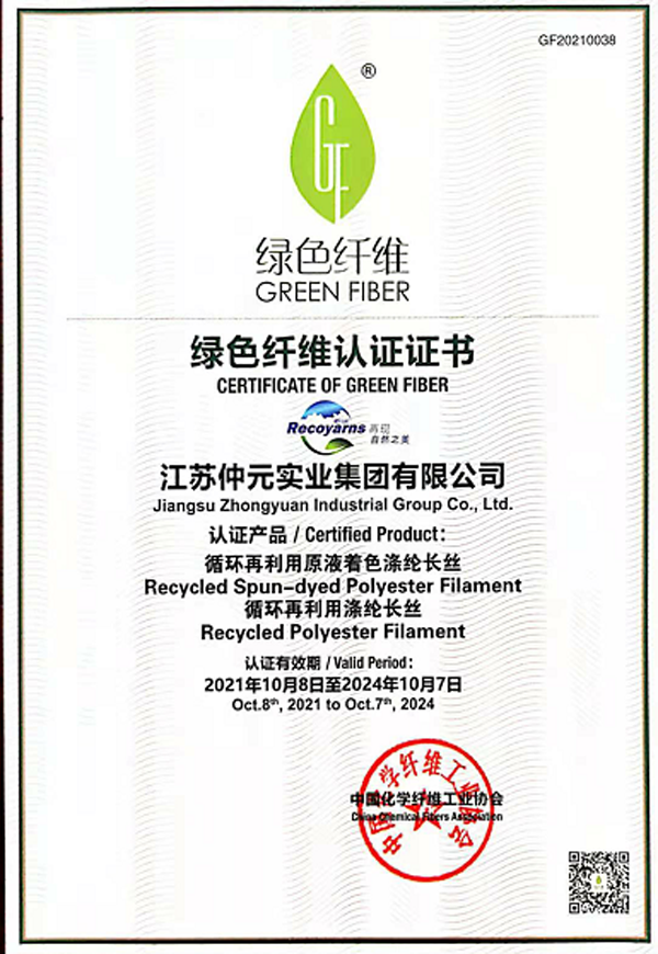 Recoyarns environmentally friendly recycled products have passed ISO9001 quality management system certification, ISO14001 environmental management system certification, global recycling standard system GRS certification, Intertek green leaf certification, EU OEKO-TEX100 certification, and China Chemical Fiber Association green fiber certification. At present, the main products of the enterprise include recycled polyester chips, recycled polyester filament POY, FDY, DTY, recycled solution colored polyester filament, and recycled functional polyester filament.