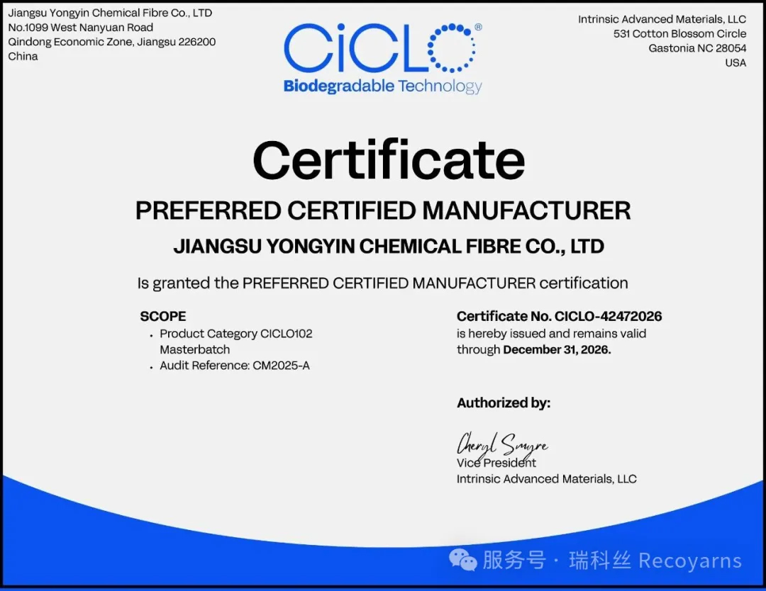 此次成為CiCLO® 可降解技術(shù)的優(yōu)選認(rèn)證制造商,不僅讓江蘇永銀化纖在國(guó)際市場(chǎng)中獲得更高曝光度與公信力,更將為其與全球品牌、零售商的深度合作搭建橋梁,助力企業(yè)進(jìn)一步拓展海外市場(chǎng),推動(dòng)中國(guó)環(huán)保化纖材料走向世界。